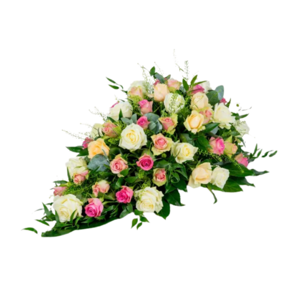 Het rouwstuk ‘Schoonheid in Stilte’ in druppelvorm is een ingetogen en stijlvol bloemwerk. Met witte, roze en crème rozen straalt dit stuk tederheid, rust en respect uit.