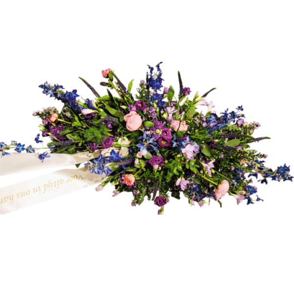 Het langwerpige rouwstuk ‘Stil van Vertrouwen’ is een ingetogen arrangement in zachte roze tinten. Het straalt rust, vertrouwen en verbondenheid uit en vormt een liefdevol, persoonlijk eerbetoon.