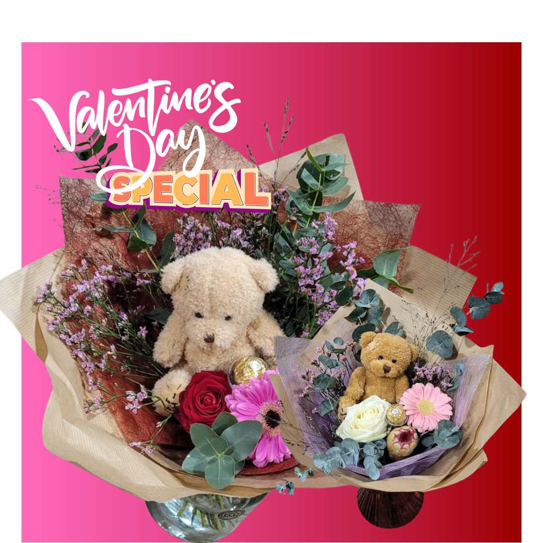 A sweet small bouquet with a cuddly teddy bear — a gentle and thoughtful gift.