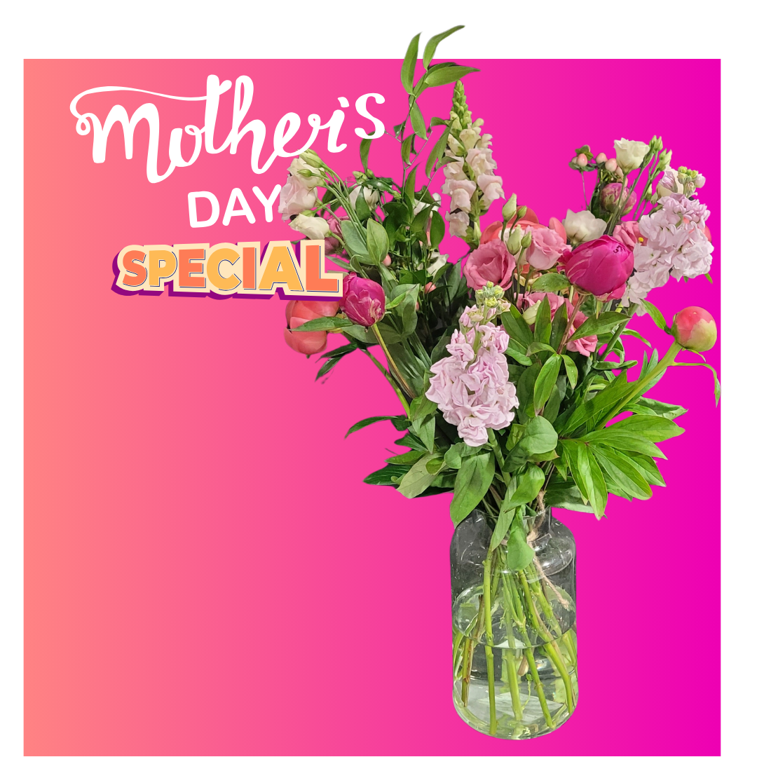 Laat je moeder genieten met een prachtig boeket vol veldbloemen en pioenrozen.