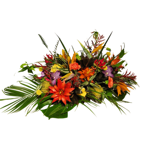 Het langwerpige rouwstuk ‘Kleurrijk Tropical’ is een exotisch arrangement met tropische bloemen in felle, warme kleuren. Het straalt energie, warmte en levendigheid uit en vormt een krachtig eerbetoon.